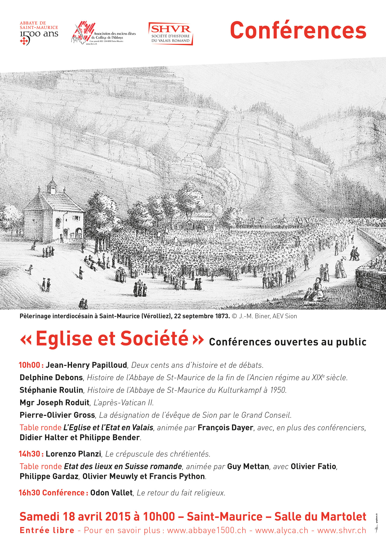 Faire le point des relations entre l’Eglise et l’Etat sur le plan valaisan et national, à l’occasion des 1500 ans de l’Abbaye de Saint-Maurice ; tel est le sujet du "Colloque laïcité", organisé le 18 avril 2015 par le comité du Jubilé, la Société d’histoire du Valais romand et l’Association des anciens élèves du Collège de Saint-Maurice. Comment l’Abbaye a-t-elle traversé les grands bouleversements qui ont marqué le dix-neuvième et le vingtième siècle, de l’Ancien Régime à nos jours? Comment les historiens, les sociologues et les politiques ont-ils vécu l’évolution des rapports de la religion avec la société civile? Toute une journée de communications et de débats ouverts au public. En point d’orgue final, un conférencier bien connu, Odon Vallet, historien des religions, évoquera le retour du fait religieux dans notre monde empreint de laïcité.